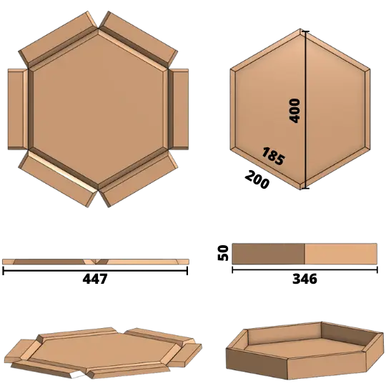 Mått. Produktens mått på bilderna är 0,4 x 0,3 m. Hexagonens maximala bredd kan vara upp till 1,0 m – ta hänsyn till transporterbarheten till installationsplatsen. Installationen kan bestå av en eller flera delar